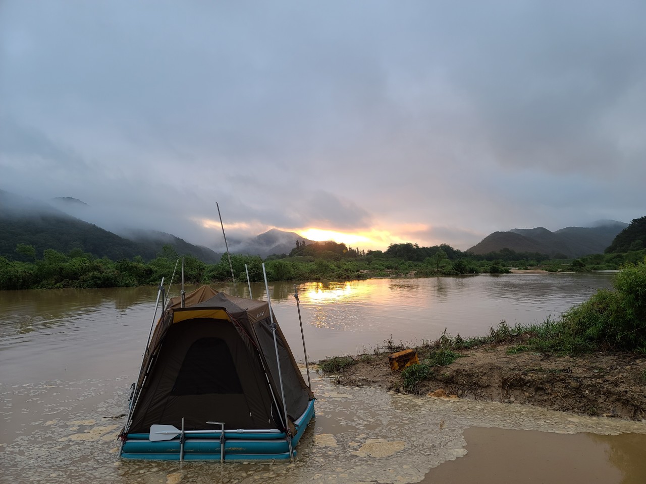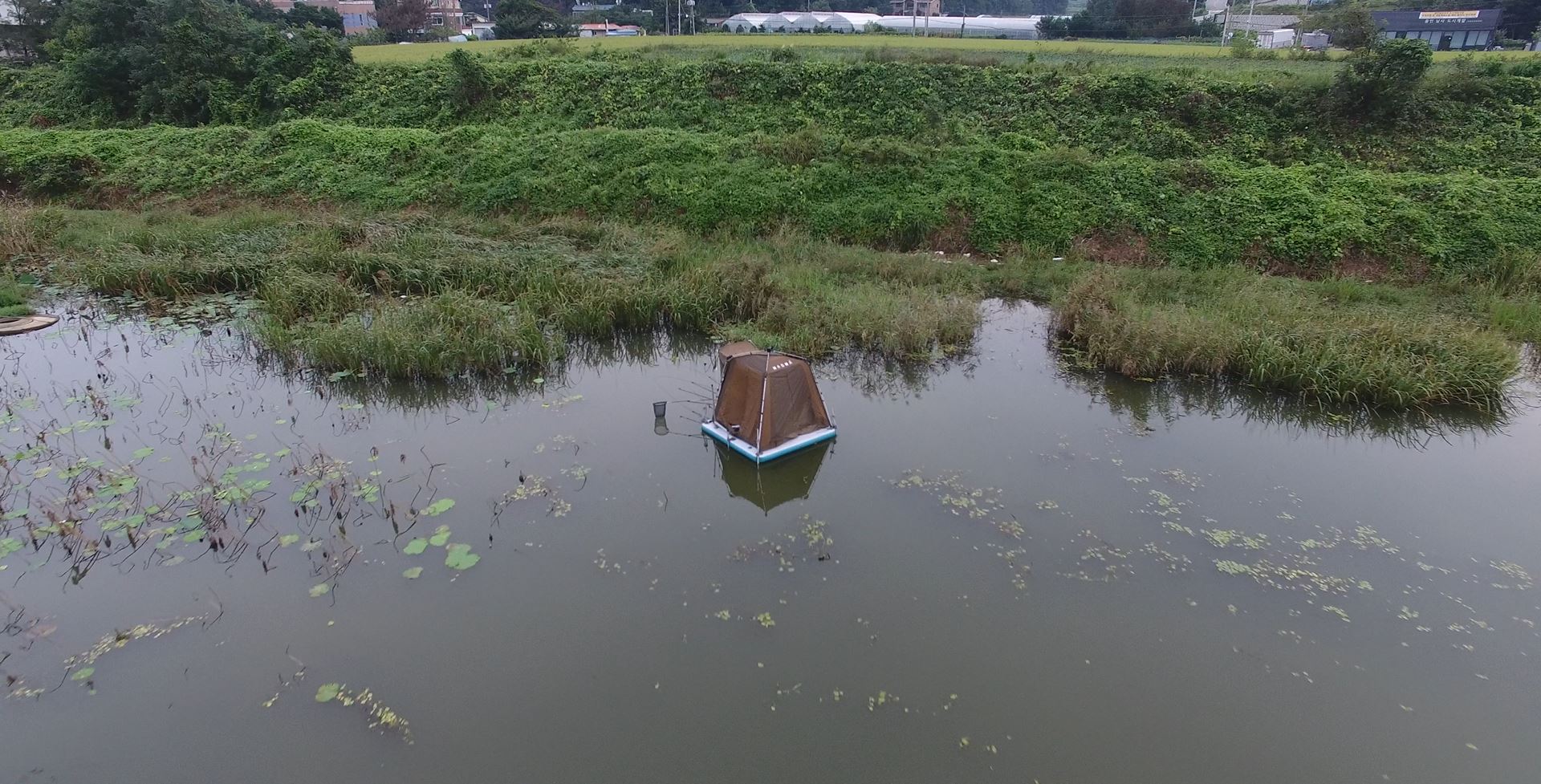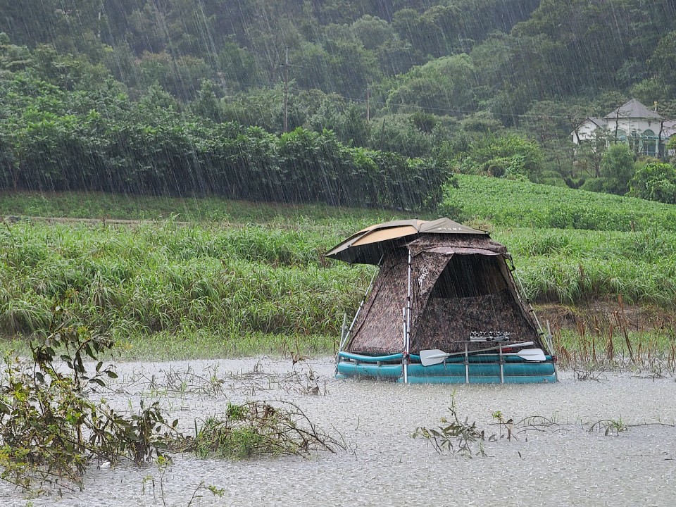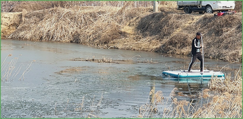 그다음 나머지 부분도 살짝 들어서 물에 띄어놓고 마그마 스카이 수상좌대로 올라갑니다